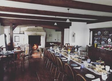 The kitchen/Dining area has 2 large dining tables to seat up to 24 guests, large aga, belfast sink, and turf fire