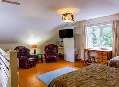 Crotlieve, Rostrevor Holidays. 1 Bedroom Cottage.Based on the shape of a barn that used to stand in its place, Crotlieve cottage is a 2-storey building at Rostrevor Holidays. Enter through the door and walk up the white stairs to your large spacious bedroom, with a comfortable double bed. A seating area as part of the bedroom allows you to relax and read a book, or watch some TV.