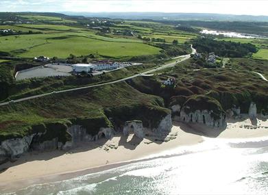 The hotel is beautifully situated atop the cliffs at White Rocks and has the reputation of having the most commanding position on the Antrim Coast. Overlooking the harbour town of Portrush and its world famous Royal Portrush Golf Course, the hotel enjoys panoramic views of County Donegal in the west, to the Giant's Causeway in the east and the Scottish Isles in the north.
