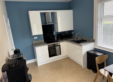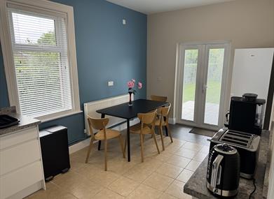 Fully equipped kitchen, with oven, hob, fridge/freezer and dining area.