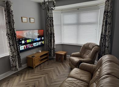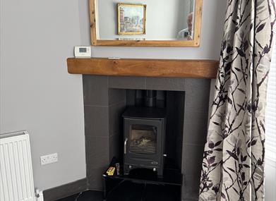Living room/lounge with 60" TV and wood-burning stove. Gas central heating and hot water.