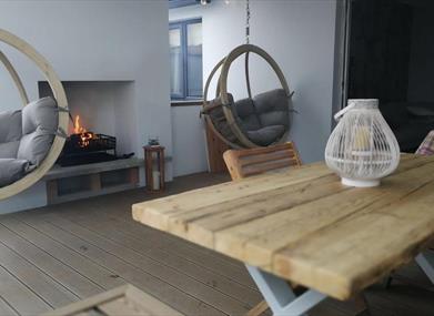 2 reception rooms: 1 with an open fire and the other open plan to (i) kitchen and (ii) via bi-fold doors, a large covered verandah with barbeque, table/chairs and hanging seats.