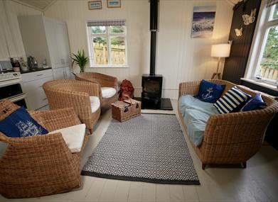 Living / Dining area has straw chairs, wood burning stove and electric heaters keeping this warm country cabin toasty even in the winter months.