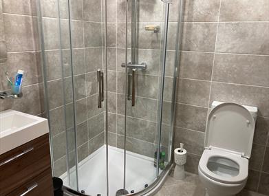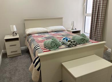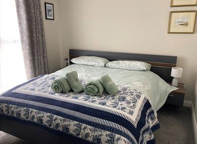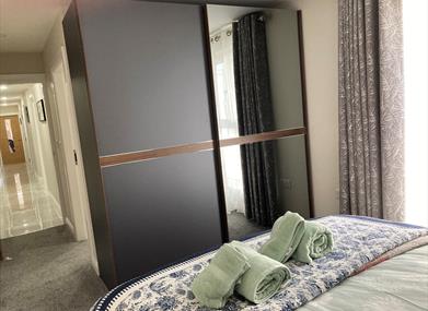 Master bedroom and ensuite: King size bed with bedside lockers, bed side lights and four wall hanging paintings. There is a large double wardrobe with hanging and drawer space. The fully tiled en suite has walk in shower, wash hand basin with storage beneath, illuminated, mirror fronted vanity cabinet, heated towel rails and toilet. Please be careful when getting in or out of the shower / bath as the floor can become slippy. Please use the non-slip mat provided. There is a hair dryer provided. External windows tilt and turn to open.