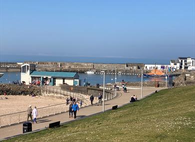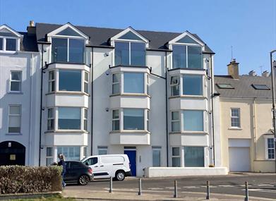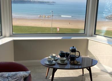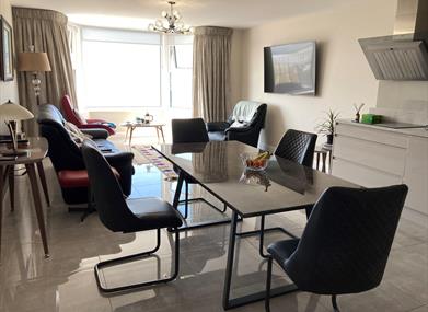 Lounge /Dining/Kitchen: In the lounge area the large front window looks out across Portrush west bay with beautiful views over the Atlantic Ocean towards Portstewart and the Donegal coast in the distance over which the sun sets in the evening. In the immediate forefront you'll overlook the famous Kerr Street Green, the west strand and Portrush harbour. The wall mounted tv comes with Freeview.