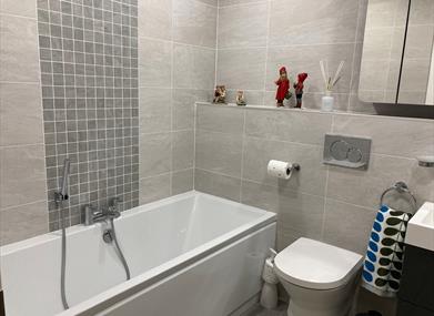 Main bathroom: The bathroom is fully tiled and has a bath with hand held shower attachment, walk in shower, wash hand basin with storage beneath, mirror fronted vanity cabinet, heated towel rails and toilet.