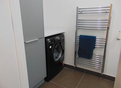 The accommodation comprises a bright and spacious open plan layout of kitchen, living and dining room. The fully fitted modern kitchen has an electric oven, gas hob, fridge freezer and dishwasher. It is well equiped with pots, pans and utensils for making meals at home. The living room has a wood burning stove and there is gas central heating throughout the home. There is a downstairs cloakroom with WC and washing machine.