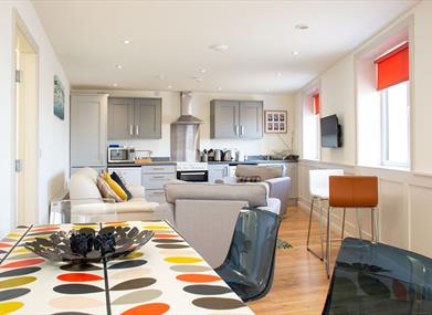 2A accommodates a maximum 4 person stay, with the choice of a double bed and sinlge in one room, and two single beds in the other. It is open plan kitchen - living - dining area.
