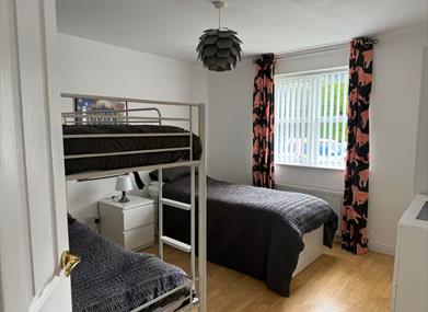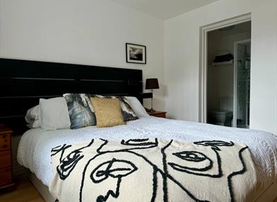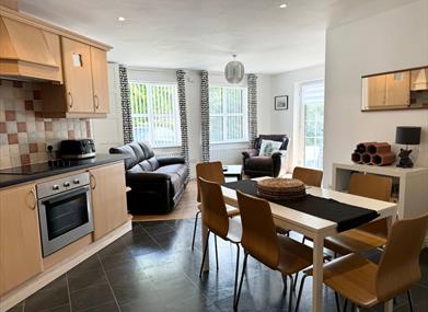 This is a bright modern ground floor apartment with its own fentrance. There are 2 bedrooms, one with ensuite and a TV. The apartment has the capacity to sleep 5 people. There is a fully equipped kitchen with dishwasher and microwave and wifi throughout. There is a selection of books and boardgames and a travel cot and highchair for younger guests.