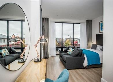 Each suite offers true residential experience in the heart of the city, with an open plan contemporary layout, complimentary high speed wi-fi and 50" Smart TV with Netflix capability. Each Suite also has a separate pull-out sofa bed with a separate high-spec bathroom and kitchen facilities that include a fridge and Microwave oven. A cooking hob is not available.