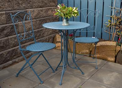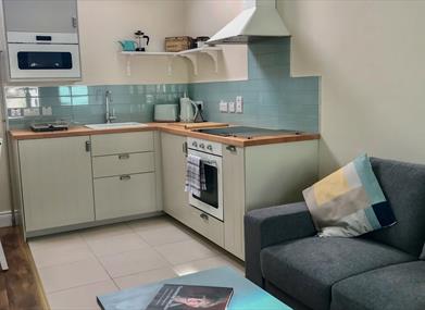 An open plan studio with double bed, lounge seating, benched dining area, fully equipped kitchen, built in wardrobe and separate bathroom. The occupants have their own outside patio with table and chairs. The apartment also has a wall mounted TV and Wi-Fi and the use of a communal utility room with washing machine, tumble dryer and iron.