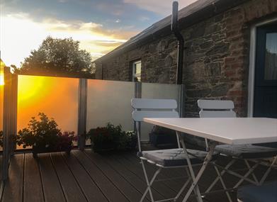 The upstairs apartment has 5 separate areas, a living/kitchen area, 2 bedrooms, bathroom, and large hall. Bedroom 1 has 2 single beds and Bedroom 2 a double bed. The living space has a fully equipped kitchen, 2 x two-seater settees, TV, electric stove, and Wi-Fi. The apartment also has its own high level extended decking with outside seating facilities and the use of a communal utility room with washing machine, tumble dryer and iron.