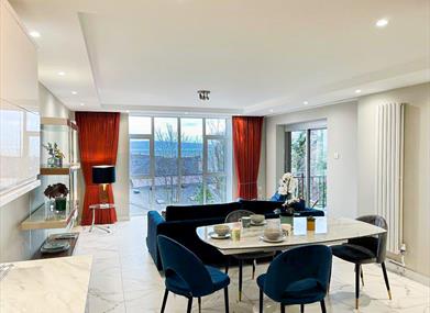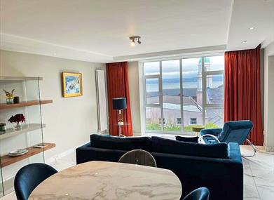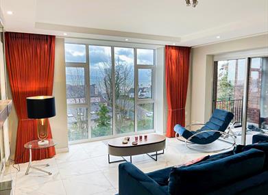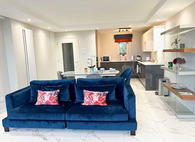 Welcome to our charming and modern apartment! With stunning views of the tranquil Belfast Lough and the Co. Down Coast, our home is the perfect escape for those looking for a peaceful retreat. As you step inside, you will be greeted by a spacious living room, featuring a luxurious velvet sofa and a modern laid back chair, the perfect spot to unwind after a long day.