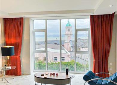 Step into our luxurious living room, where comfort and style come together in perfect harmony. The room boasts a plush velvet sofa that will make you want to sink in and relax. The large windows opposite the sofa offer panoramic views of Belfast Lough and the Co. Down Coast, making it the perfect spot to sit and watch the world go by. Additionally, there is a modern and comfy laid-back chair that provides a cosy space for reading or lounging. The room is furnished with modern touches, including a sleek coffee table, which adds a touch of elegance to the space. The ambient lighting in the corner creates a warm and inviting atmosphere, perfect for unwinding after a long day of exploring. Come and experience the ultimate relaxation in our living room.