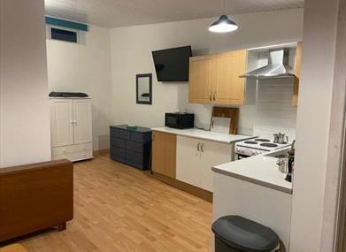 This one bed studio apartment has a fully equipped kitchen, comfortable sitting area with TV and modern shower room. Access to washing machine and tumble drier. Large secure enclosed yard for safe storage of bikes, kayaks and canoes.