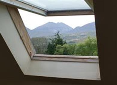 The living room has an open log fire and chimney rising to the vaulted ceiling. On one side of the sitting room there is a patio door with spectacular views of the mountains and on the other side there is a door leading to a storage cupboard that can be used as a drying room.