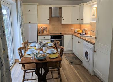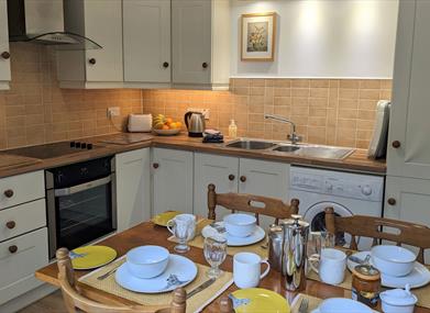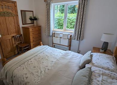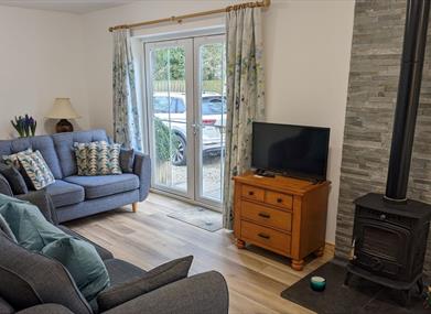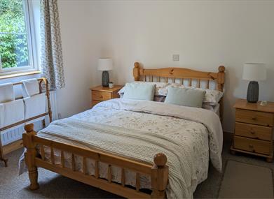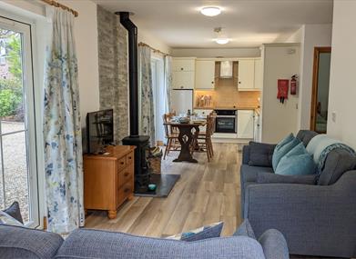 Tree Top Ground Floor Apartment accommodates four people and is located in a private garden surrounded by a small woodland. The apartment has a double bedroom and a twin bedroom with built in wardrobe which share a bathroom. A cot and high chair can also be made available if required. The apartment has an open plan kitchen dinning living area with wood burning stove.The fully equipped kitchen has a fridge freezer, microwave, hob, oven, kettle, toaster and washer dryer. The living area has a smart TV and a wireless internet connection. All bed linen and towels are provided as are basic supplies such as cling film, tin foil, bin bags etc. a complimentary basket of logs is also provided for the wood burning stove.