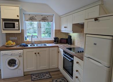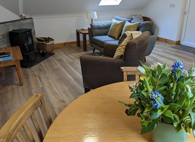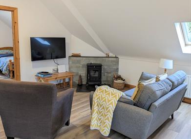 The apartment has a double ensuite bedroom with a built in wardrobe and is ideal for a couple. The apartment has an open plan kitchen dinning living area with wood burning stove.The fully equipped kitchen has a fridge freezer, microwave, hob, oven and washer dryer. The living area have TV & DVD players and a wireless internet connection. All bed linen and towels are provided as are basic supplies such as cling film, tin foil, bin bags etc.