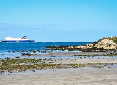A footpath runs westward, passing by a golf course, and leads to the peaceful Ferris Bay beach. This bay is bordered by Ferris Point, home to a lighthouse guiding ships into the bustling port of Larne.
