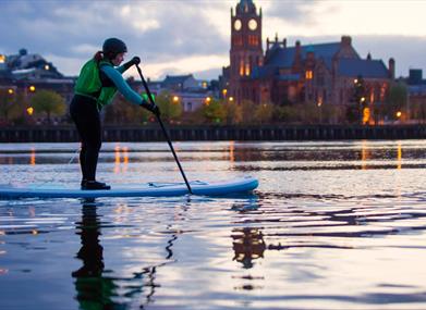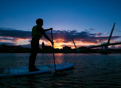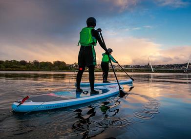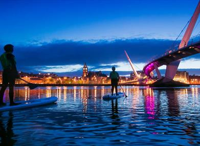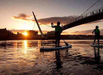 Our 2 hour City Paddle Boards tour is a superb way to unwind, learn how to SUP with a qualified instructor or progress your existing skills in a relaxed way. The activity is suitable for individuals or small groups up to 10 people aged 16 years and above.Of course the tidal estuary of the famous Feabhail (pronounced fyauil) or Foyle River flows through the city. To the north is the Atlantic Ocean and to the south, the heart of Donegal in historic Ulster. Your tour goes upstream or down with the flowing tide.