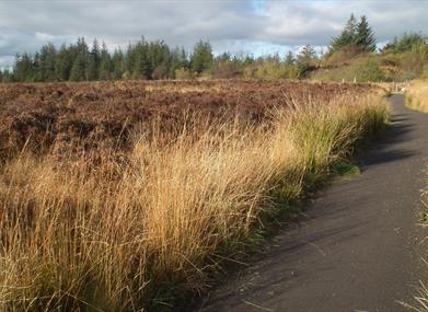 Continue straight ahead for a further kilometre through the densest part of the forest where you will emerge to a landscape of open bogland and the sound of Glassagh Burn, draining water from the spongy landscape. Pausing here you will see a rocky outcrop known as Cashel. The path leads round to the left following the meander of the burn and the edge of the forest to your left. The main road will slowly come into earshot now and the path turns to take you back in an easterly direction. You will come to a left-hand bend now which takes you away from the main road and back into the forest where you will shortly return to the cross-roads encountered earlier. Take right here to retrace your steps back to the start
