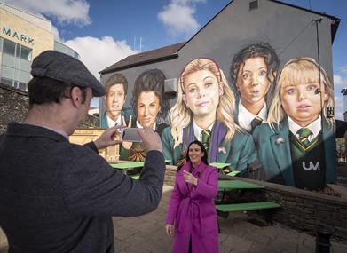 The Derry Girls Mural was created by a local not-for-profit company, UV Arts, and is located on the side of Badger’s Bar and Restaurant, opposite the Foyleside shopping centre.