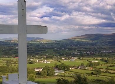 The walk eventually begins to lead on to steeper open mountain slopes with stunning views out to the Mourne mountains in the west as we track up Gullion’s Southern slopes to the Bronze age multi cist burial cairn. Camlough lake far below is a sight to behold.