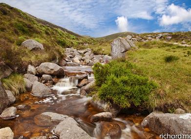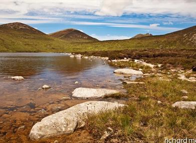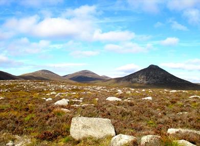 This walk starts at the Banns Road car park. The track from the car park (known as Banns Road) is in constant use by farmers husbanding their sheep. Please take care not to obstruct the track at any time. Bann's Road winds uphill to Lough Shannagh crossing the Mourne Wall and the Miner's Hole River; the name recalling unsuccessful excavations for metal ores by Cornish miners. The track proper ends amidst a flat expanse of white granite gravel and eroded peat hags. From here pick your way towards the northern edge of Lough Shannagh, (the lake of the fox), in an anti clockwise direction. At its north-east corner the lough's outflow is dammed by a low stone embankment. Cross the river below the dam. Follow the shoreline to the north end of the lough and then ascend (over a boggy, pathless terrain) to a height of 50m to find a path. From here contour left (west) for approx. 600m to reach an obvious grassy gully which ascends directly to the Mourne Wall. Continue left (900m) to the summit of Carn Mountain. The rocky mountain, which overlooks the Lough, is Doan (594m), which if climbed by the left flank (northwest) provides a rewarding view (this excursion adds an hour to the time taken to complete the walk). To complete the walk, follow a wall leading left down the south face of Carn Mountain (this is not the Mourne Wall; the latter turns right from the summit to continue over Slieve Muck). At the base of the hill the wall breaks at its junction with the Miners Hole River. Turn left at the break and follow the left back of the river (no path) back to the stone bridge on the Banns Road Track. (1km) Return to the start via the same route. Please be aware - Although, there are numerous walking routes in the Mournes, the majority of these popular walks are not formally designated public rights of way. Most routes have developed over time due to traditional use. Below 600feet (180m) most land is privately owned and is farmed or grazed. Many of the traditional access routes cross this land or pass along farm lanes and quarry tracks. Walkers are advised to respect that they may be walking on private land and are encouraged to make themselves aware of and adhere to the principles of 'Leave No Trace' - www.leavenotraceireland.org" Please remember that much of the land you will cross is private property and access is only available through the goodwill of the landowners. Although some areas of the countryside have been traditionally used for recreation, the public have no general rights to access such land and are only walking with the tolerance of the landowner.