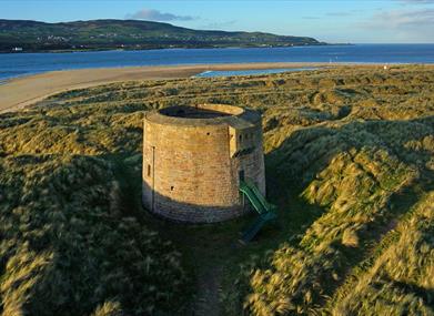 Arriving at Magilligan Point, follow the road past the Point Bar leading to a car park adjacent to the boundary of Magilligan Nature Reserve. Park on the left hand side of the road and then pass through the kissing gate to view the Martello Tower straight ahead.