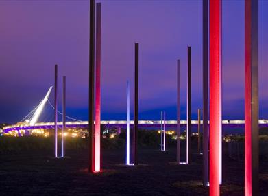 Created by two internationally recognised artists, Vong Phaophanit, a former Turner Prize nominee (1993) and Claire Oboussier, the artwork is made up of columns that reflect and refract natural light and create a play of shadows during the day and transform into a gently animated silent field of light against the night time sky. The palette of colours illuminating the installation was inspired by the stained glass in the Guildhall.