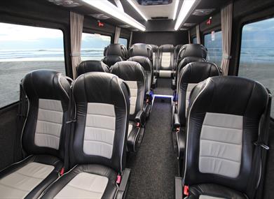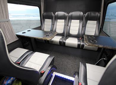 Reclining leather seats, rear tables, power and USB points, air conditioning, cool box, privacy glass, large boot and overhead racks.
