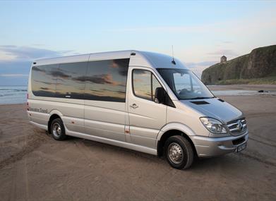 VIP transport for golfers visiting Ireland. Luxury 16 seater Mercedes mini coach. Suits groups of 8 golfers with clubs and luggage.