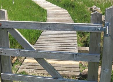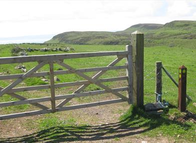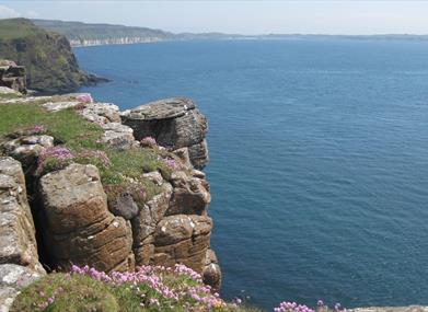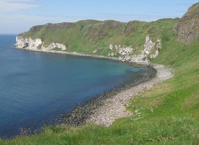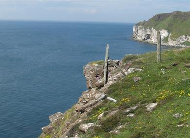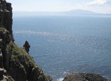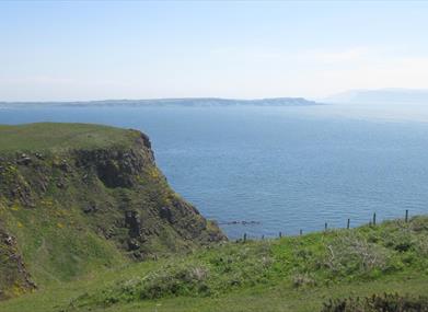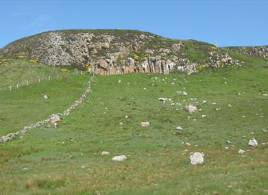 Follow the road to your left leading west from the harbour. Turn right by the church and up the Church Brae to the chapel. Follow the road to the left and continue on this for 4.2 km until reaching Kinramer Camping Barn on the left hand side (a white traditional style cottage with white outbuilding opposite a black barn). During the summer months you can get the Puffin Bus from the harbour and ask to get off at Kinramer Camping Barn, if you would prefer. 50m to the right when looking at Kinramer Camping Barn is a wooden gate with green waymarkers attached. Follow these waymarkers into the field and for the rest of the route. Continue through the field and cross the board walk, continue skirting the hill for 300m then make your way to the top. Follow waymarkers that lead you down hill on the seaward side, skirting the hill to the right. Continue to descend by dropping down a steep section, again bear right and follow the fenceline to the cliff top. When descending this section look back towards to hill to see basalt columns that are the same structure as those found on the Giants Causeway. Follow the cliff top to the left hand side. Bear left up a small stream valley, before using a style to cross a stream on your right hand side. Continue over the small hill and bear left in the next field to arrive at a wooden gate leading onto the road. Bear left on the road to arrive back at the Kinramer Camping Barn. Please note that there may be livestock present on this trail and that the route is adjacent sea cliffs.