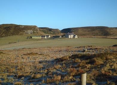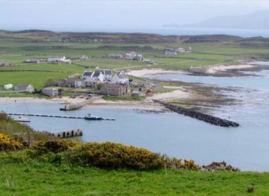 Route: At the harbour you may choose to go left to take the steep route: turn right by the church and up the Church Brae to the chapel; or you may choose to go right, pass the Manor House and take the first left by McCuaig's Bar and left again at the cross roads (peering over the wall into the field to see the ancient Standing Stone).