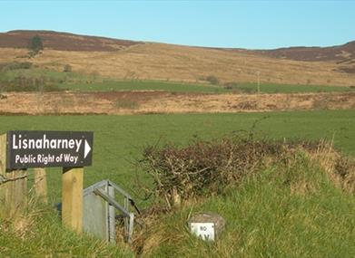Park at Gortin Glen Forest Park. Exit the Park, cross the road and turn first right onto the Lisnaharney Road. At the 5th road junction on the right hand side, leave the road and walk uphill along the Lisnaharney public right of way. From the top of the hill descend to the road, turning left at the bottom. Walk along the road until turning left again onto the Eskeradooey public right of way. This path leads to the top of the hill and then descends back to the Lisnaharney Road. On reaching the road turn left and retrace your steps back to the car park at Gortin Glens Forest Park.
