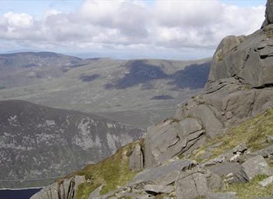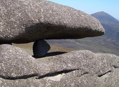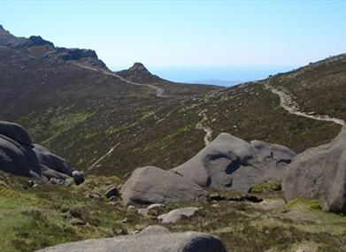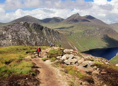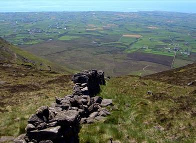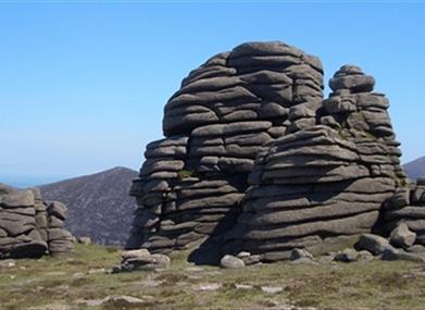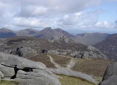 From the Carrick Little car park, follow a clear, stony track that rises gently between the fields. Note the boulder walls alongside, and the high mountains around the distant head of Annalong Valley. Cross a stone step stile beside an iron gate and turn left to follow the Mourne Wall uphill. The wall rises steeply on the rugged slopes of Slieve Binnian, but it is an obvious line to follow almost all the way to the summit. There is a break when the wall runs into a bare face of granite, and before this point you should drift to the right and aim for a notch in the top of the mountain. Going all the way to the summit at 2449ft (747m) involves using your hands and taking care on the rock. The reward is an exceedingly fine panorama of the surrounding mountain. In clear weather it's possible to see the Isle of Man out to sea and the Wicklow Mountains beyond Dublin. Pick your way carefully around the base of the Summit Tor and continue walking along the ridge of the Mountain. You cross a broken wall and follow a clear path past the Back Castles. These are a handful of wrinkly little tors that you don't have to grapple with. Simply enjoy the views as you walk past them. The North Tor is a monstrous outcrop of granite towards the end of the crest, and the path passes it on the left side. The ground slopes away more steeply as the path wanders through the heather, past boulders and outcrops of granite on the way down to a prominent gap - the col between Slieve Lamagan and Slieve Binnian. At the col turn right and follow a clear path downhill. This passes close to the Blue Lough and by keeping right at junctions with other paths, you'll be led down to a clear track passing a corner of Annalong Wood. Simply follow the track alongside the Forest fence and return to the iron gate in the Mourne Wall. Cross the wall using the stile and follow the track back to Carrick Little car park. Please be aware - although, there are numerous walking routes in the Mournes, the majority of these popular walks are not formally designated public rights of way. Most routes have developed over time due to traditional use. Below 600 feet (180m) most land is privately owned and is farmed or grazed. Many of the traditional access routes cross this land or pass along farm lanes and quarry tracks. Access is only available therefore through the tolerance and goodwill of the landowners. Walkers are advised to respect that they may be walking on private land and are encouraged to make themselves aware of and adhere to the principles of Leave No Trace' - www.leavenotraceireland.org