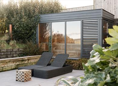 Heated Day Bed & Relaxation Area - in a space of relaxation, rest on day beds or the gently-heated day beds and enjoy views of Fairhead.