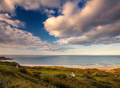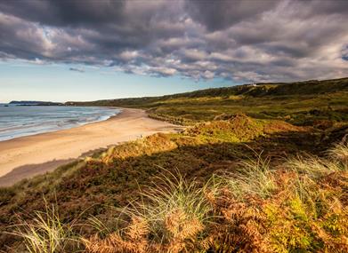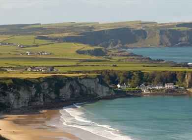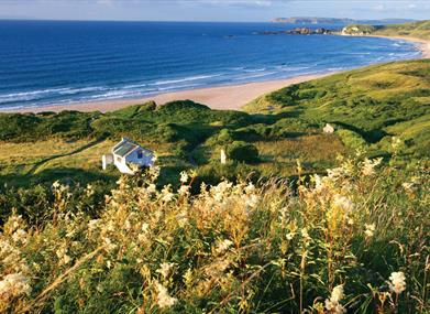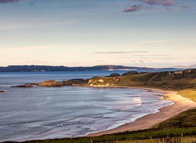 The spectacular sandy beach forms a white arc between two headlands on the North Antrim coast. In this secluded location, even on a busy day there is plenty of room for quiet relaxation.