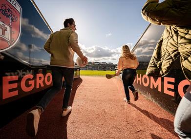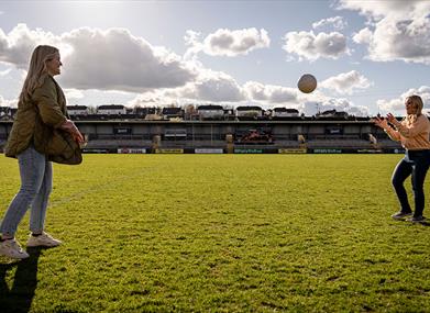 As you head through the players’ tunnel and out onto the pitch, try not to be distracted by Armagh’s famous cathedrals on the skyline: it’s time for your training session! You’ll get a demonstration of the skills that players need to make it to county level, including the art of swiftly lifting a football from the ground, soloing, hand-passing and how to use a sliotar (hurling ball) and a hurl (hurling stick).