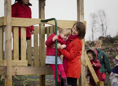 Bunkers Hill is a small, recently felled forest at the edge of Castlewellan Town. Developed in October 2014 this short circular trail is suitable for walking and family cycling only and incorporates 3 panoramic viewpoints.It is complemented by a Natural Play Trail for children aged between 4 and 11 years. The Play Trail is the first of its kind in Castlewellan and is made almost entirely out of natural materials. It includes basket swings, a lookout tower, amphitheatre and seats as well as a bespoke climbing wall.