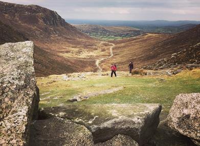 The Hare's Gap is the most dramatic mountain pass in the Mournes. Its sharply defined outline indicates that ice once passed this way; using the Gap's convenient north-south alignment to advance and retreat over the entire Mournes range. In more recent times the Hare's Gap marked the exit point for smuggled goods which had crossed the hills from the coast along the Brandy Pad. The contraband (which included soap, leather, spices and coffee) was carried through the mountains on the backs of small ponies which descended by the Hare's Gap to the valley of the Trassey River and on to Hilltown (a favourite distribution centre). Nowadays, the Gap's easily reached central location on the rim of the High Mournes makes it a popular starting point for routes scaling adjoining peaks, or simply for a walk along the gentle contours of the Brandy Pad.
