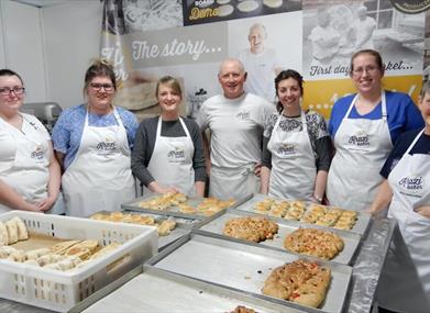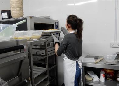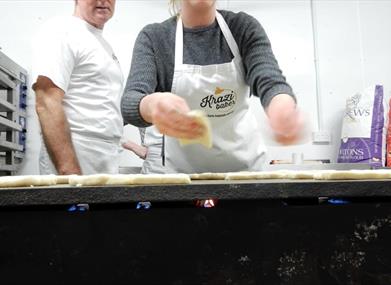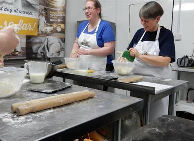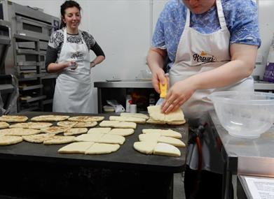 In your baking class you’ll get an introduction to using yeast by making and kneading your focaccia dough. Once the dough has been formed it is set aside in a bowl with cling film, encouraging the yeast to activate causing the dough to rise. In the meantime we begin making scones, with the option of keeping it plain or adding raspberry and white chocolate.The scone dough is formed together and kneaded, rolled out and cut using appropriate scone cutters. Once the scones are into the oven the focaccia dough will have increased in size and depending on temperature may be ready to bake. When using the focaccia dough you can keep it plain with rosemary and rock salt or make a tear and share bread with roasted peppers, onions, and rock salt. The class is normally split 50/50 on this one.