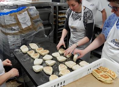 Once the focaccia dough has been shaped correctly its set off to the side with cling film over it on a baking tray to rise even more. Scones will be ready by now and come out of the oven ready to eat. While the focaccia dough is rising we move on to soda bread. This is where the Irish tradtion is kept in the class, with the soda and potato bread being baked on a traditonal gas-griddle hot plate where you can watch it being baked right in front of you. For both the potato and soda bread visitors are encouraged to set and lift their items on and off the hot plate by themselves for the full experience. After the potato bread is set onto the hotplate to bake the Focaccia bread is ready for the oven and will be ready after the Soda bread is baked on the hot plate.