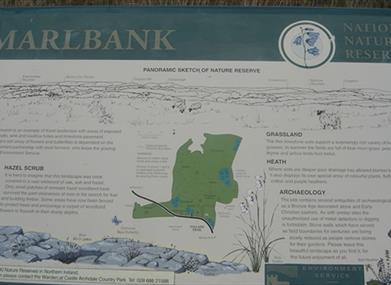 Route: The Marlbank Reserve is sandwiched between Cuilcagh Mountain and the Erne Lowlands and is amid the most extensive area of limestone grassland in Northern Ireland. The walk begins in the NIEA car park. The route can be taken either clockwise or anticlockwise. Follow the arrows and waymarkers around this short trail. At one time the entire area was wooded with hazel, elm and ash. With the clearances for farming since the Stone Age, only a few patches of hazel scrub now remain. The scrub shelters delicate woodland flowers including wood sorrel and primroses. The cuckoo is frequently heard in May. Meadow pipits perch on branches but are most commonly seen rising and falling in jerky flight over the grassland. The thin soils covering the grey limestone support a rich variety of herbs and grasses. The grasses are grazed by sheep and this allows herbs like the colourful pink thyme, blue harebell and yellow bird's-foot trefoil, to flower and set seed. These herbs in turn provide food for insects such as the common blue and peacock butterflies. In a patch of heath, bog cotton and yellow bog asphodel grow amongst ling heather. The Irish hare leaves conspicuous trails through the heath by nibbling off the heather shoots. Stoats can be observed darting along dry stone walls.