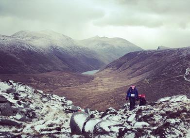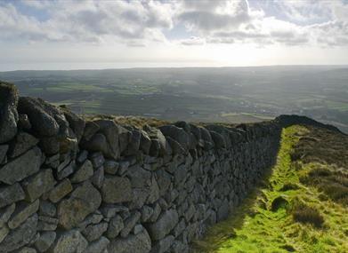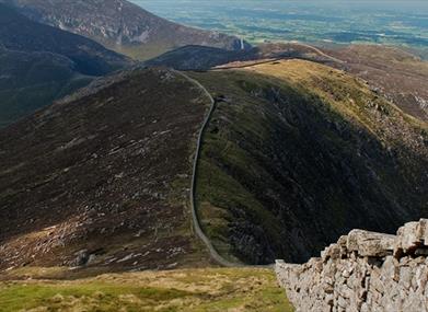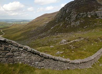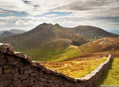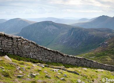 From Carricklittle car park, take the track northwards for 1 km and cross the Mourne Wall using the stile provided. Follow the Mourne Wall to the north west and ascend Slieve Binnian (747m). The wall rises steeply on the rugged slopes of Slieve Binnian, but it is an obvious line to follow almost all the way to the summit. There is a break when the wall runs into a bare face of granite, and before this point you should bear right and aim for a notch in the top of the mountain. Going all the way to the summit involves easy scrambling to summit the tors and taking care on the rock. The reward is a fine panorama of the surrounding mountains. In clear weather it's possible to see the Isle of Man out to sea and the Wicklow Mountains beyond Dublin. Continue following the Mourne Wall in a south westerly direction, descending steeply to Wee Binnian and across Moolieve. Continue the descent following the Mourne Wall to Silent Valley Mountain Park. A network of paths lead west across to the other side of the park. You can cut across at this point and travel west to regain the wall or continue following the wall south until the wall ends at the junction of Head Road and the entrance to Silent Valley Park. Continue in a westerly direction along Head Road for 1km and regain the wall where it meets Head Road after the forested area to the north ends. Continue along the wall in a northerly direction for 1.5 km where the wall takes a sharp westerly turn. After 500m, there is a junction of two walls, follow the wall to the north east to ascend Slievenaglogh. Descend Slievenaglogh following the Mourne Wall in a north westerly direction, crossing the Bann Road and steeply ascending towards Slieve Muck (674m). At the summit of Slieve Muck, take the northerly fork in the Mourne Wall. Continue east along this route to the summit of Carn Mountain (588m). Follow the Mourne Wall, passing Lough Shannagh on the right. Continue following the Mourne Wall to traverse the summits of Slieve Loughshannagh (619m) and Slieve Meelbeg (708m), up to the summit of Slieve Meelmore (687m). Continue to descend steeply following the wall in a south easterly direction, cross Pollaphuca and ascend Slieve Bearnagh (739m). Continue following the Mourne Wall in a north easterly direction to descend into Hare’s Gap. From Hare’s Gap ascend Slievenaglogh (586m). Continue following the wall in an east to south easterly direction to ascend Slieve Commedagh. Excellent views of Newcastle, Donard Wood and the Glen River can be enjoyed here. Continue east along the wall to ascend the highest mountain in Northern Ireland, Slieve Donard (853m). The summit provides spectacular views of the coast and as far afield as Belfast, 30 miles north, and Dublin, 55 miles to the south. Continue descending along the Mourne Wall in a southerly direction where the Bog of Donard spreads out before you. Continue along the Mourne Wall skirting past Chimney Rock Mountain to the east and Rocky Mountain to the west. From the north east side of Rocky Mountain, the wall trends south east towards Long Seefin. From here the 90 degree turn in the wall will lead you towards Annalong Wood. Continue following the wall for 500m, to meet a minor untarred road. Follow this road in a south easterly direction to meet the Head Road at Rourkes Park. Follow the Head Road in a westerly direction for 1.5km back to Carricklittle car park. Please be aware that this walking route passes through areas of open land such as hillside, working farmland and working forests. Livestock may be present, ground conditions may be uneven or wet underfoot and all forestry signage should be adhered to. Please refer to the ‘Walk Safely’ information that can be found at the link below.