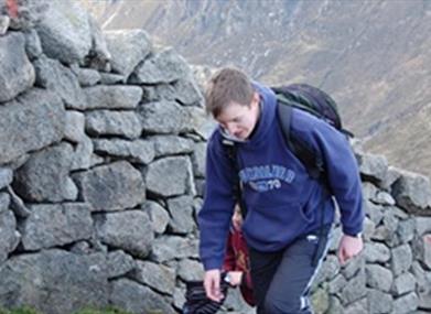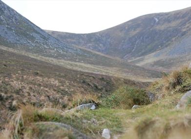 From the southern end of the car park cross the main A2 road to reach a gate. Pass through and follow the path on the right hand side of the Bloody Bridge River. Look out for the attractive stonework of the original Bloody Bridge. During the 1641 rebellion this was the scene of a massacre of prisoners on escort from Newry to Newcastle. In common with most Mourne rivers, the Bloody Bridge River is a ‘spate river’: carrying little more than a trickle in dry weather, but swelling to a torrent during heavy rainfall. In addition, it occupies an outsize glaciated valley and its waters have eroded through a bank of glacial sand, boulders and gravel (called a moraine) to reach the sea. The exposed cliff-like face of the moraine is visible (left) upstream of the old bridge. After 750m the path narrows and crosses a wooden footbridge at the confluence of the Bloody Bridge and Glen Fofanny Rivers before (in 50m) reaching the stile. Beyond the stile the path picks its way upstream. After 400m look for an obvious slab of rock inclining towards a narrow section of river. Several conveniently placed boulders make this an easy crossing point. Continue upstream along the opposite bank. After 80m the path climbs above the river’s course, twisting back on itself (seawards) along a broad track giving views across the valley. View north. From this point Slieve Donard is largely hidden by the bulk of Crossone whose lower slopes form a watershed dividing the Bloody Bridge and Glen Fofanny Rivers. The long shelf of Leganabruchan borders Glen Fofanny on its northern side with the edge of Donard Wood just visible against the backdrop of Dundrum Bay. Continue for 30m before turning sharp right onto a narrower track which zig-zags uphill. PLEASE KEEP TO THE ZIG-ZAG SECTION OF PATH AND DO NOT TAKE SHORT-CUTS. Above the zig-zag, the path follows an old quarry track which extends 1.4km into the upper valley before skirting (right) along the north side of the quarry. From a vantage point above the quarry the line of a disused railway leading to Carr’s Face on the slopes of Chimney Rock Mountain can be discerned. Large flat granite slabs were hewn from this area for use as ornamental stone or as foundation blocks in post-war construction works. Beyond the quarry the path meets the Mourne Wall at 750m. From here Slieve Donard can be reached by following the Mourne Wall uphill for 1km to the tower on the mountain summit. On a clear day the panorama from Slieve Donard is superb. In particular, note the continuation of the Brandy Pad further west and the scale of the quarry operation on the side of Chimney Rock Mountain – now vividly revealed from Donard’s viewpoint. Please be aware - Although, there are numerous walking routes in the Mournes, the majority of these popular walks are not formally designated public rights of way. Most routes have developed over time due to traditional use. Below 600 feet (180m) most land is privately owned and is farmed or grazed. Many of the traditional access routes cross this land or pass along farm lanes and quarry tracks. Walkers are advised to respect that they may be walking on private land and are encouraged to make themselves aware of and adhere to the principles of 'Leave No Trace' - www.leavenotraceireland.org" Please remember that much of the land you will cross is private property and access is only available through the goodwill of the landowners. Although some areas of the countryside have been traditionally used for recreation, the public have no general rights to access such land and are only walking with the tolerance of the landowner.