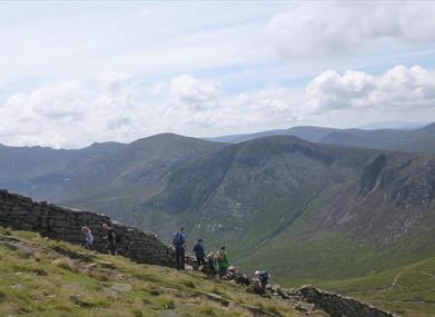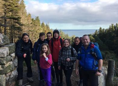 Follow the beautiful Glen River track through Donard Wood until we reach the open mountain landscape, the stunning river valley opens in front of us, with Donard to our left, and Slieve Comedagh to our right. During our Guided Walk, we will explain the history of Granite quarrying on Slieve Donard’s slopes. We will share with you the story of The Mourne wall and the men who built it. Once you reach the summit, with any luck, you will enjoy stunning vistas of the Irish sea, you might catch a glimpse of the Isle of Man.Slieve Donard towers over Newcastle far below with views out over Dundrum bay. On a good day there are views as far as Dublin Bay up the Irish coastline in one direction and Belfast lough in the other. The 853 m summit is quite a hike because we start from Sea level but well worth it.