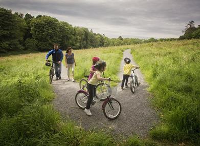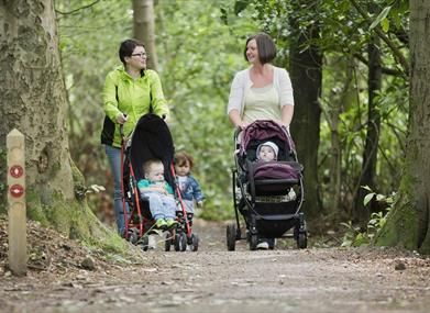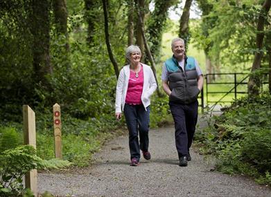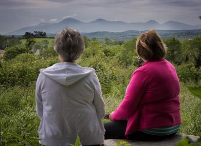 Starting in the car park behind the walled garden the trail is travelled in an anticlockwise direction following the waymarkers. The trail begins through a wooded area to the rear of St Colmcilles high School. (At weekends car parking and trail access are available from the main car park, accessed off the Downpatrick Road). Upon reaching the driveway, cross over and look out for a foundation which was the military outlook post when British and American troops occupied the grounds in WWII. Follow the path through an area of dense rhododendron with the option of taking the shorter route directly to ‘Mary’s Well’ (a holy well) translated into Irish means ‘Tobar Mhuire’. From here continue along the path, crossing the main driveway to either proceed up the hill or take a short detour left for a view of the original Crossgar House. Please note: this section of the trail is linear and visitors will need to retrace their steps to continue the trail up the hill. The trail then winds its way up the hill to the seated viewpoint area affording visitors a spectacular view of the Mournes (on a clear day!). The trail then proceeds through the wooded area where there is plenty of opportunities to explore and play, after which the trail descends down the hill and back to the car park. Visitors are also welcome to visit the Walled Garden to enjoy the newly restored pond and look upon the impressive glasshouse - permission via Retreat Centre.