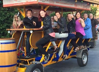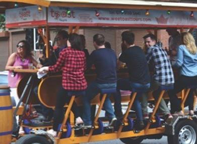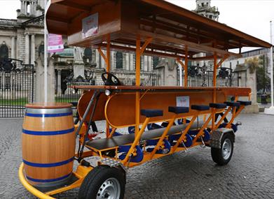 Enjoy a wee toast on a unique cycle tour through the streets of Belfast. Travel in style and experience the Belfast landmarks in a completely different way. Raise a toast with your companions as you travel. Cycle to our locals for a pint and experience our world famous pubs. Get ready to sample the sights and sounds of Belfast, whilst enjoying a drink at our on-board moving bar.