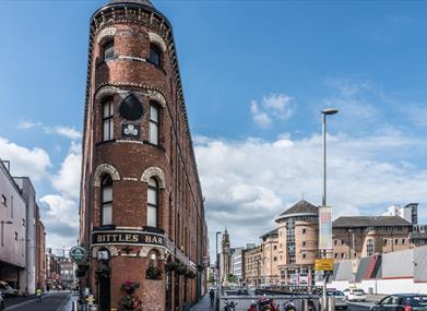 Bittles Bar is one of Belfast's more curious pubs located close to the bustling Victoria Square. Red-bricked and 'flat-iron' in shape Bittles is a wonderful example of a traditional Victorian Bar. Founded in 1868 the bar was originally called the Shakespeare reflecting is theatrical clientele.